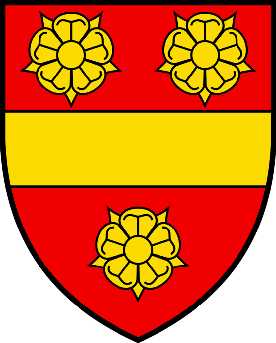 De gueules à la fasce d'or accompagnée de trois roses du même.